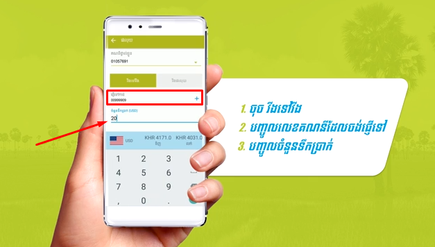 ចូរអ្នកបំពេញលេខគណនីវីងខាងលើ ឬគណនីដែលអ្នកចង់ផ្ញើទៅ រួចបំពេញចំនួនទឹកប្រាក់ រួចហើយចុចពាក្យថា “ផ្ញើ” ។