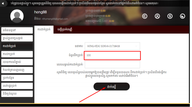 សូមបំពេញចំនួនទឹកប្រាក់ដែលអ្នកចង់ធ្វើការចូលលេងជាមួយនឹងវេបសាយយើងខ្ញុំរួចដាក់ស្នើរគឺជាការស្រេច។